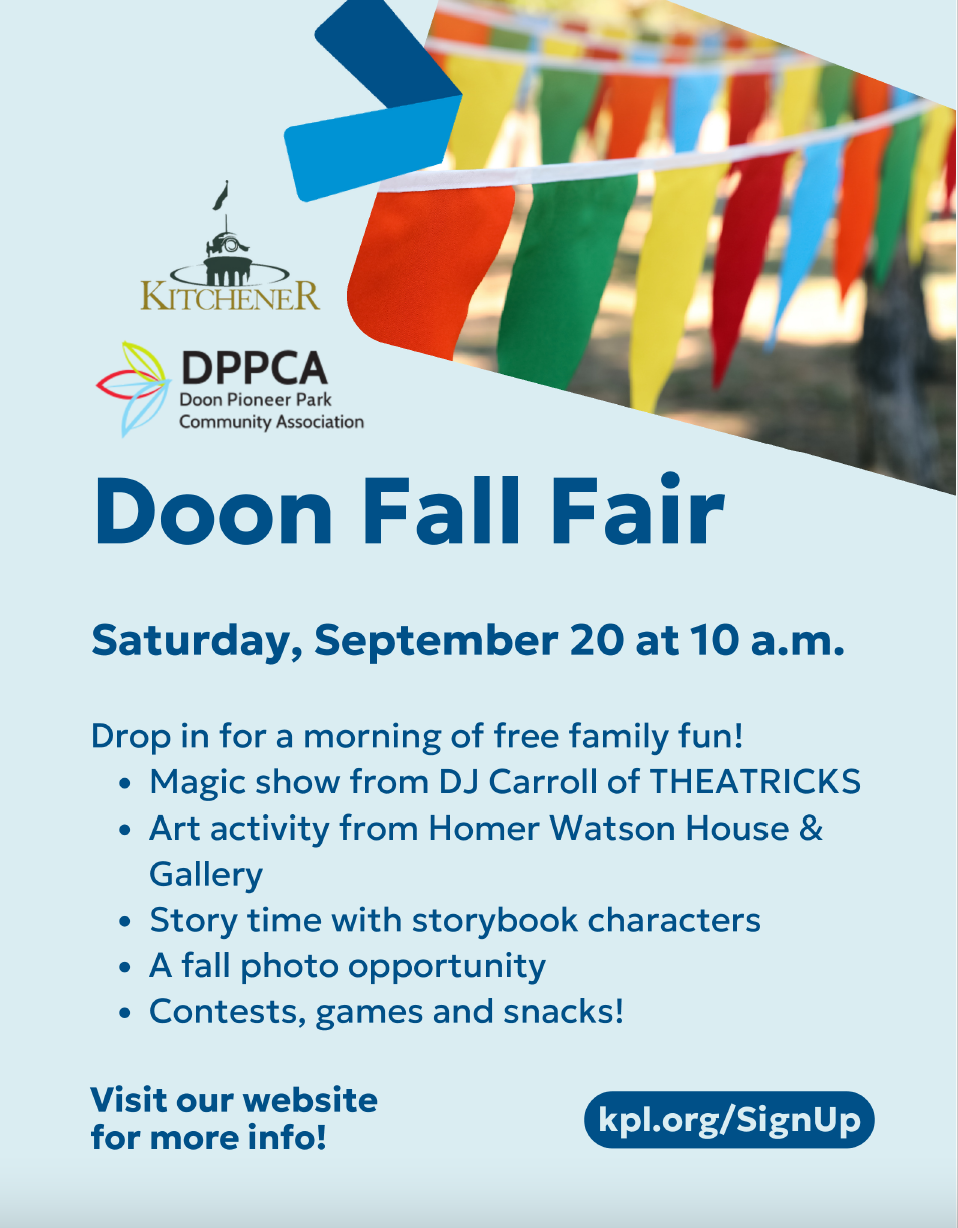 Back to All Events Doon Fall Fair on Saturday Saturday, September 20, 2025 10:00 a.m. 12:00 p.m. Google Calendar ICS